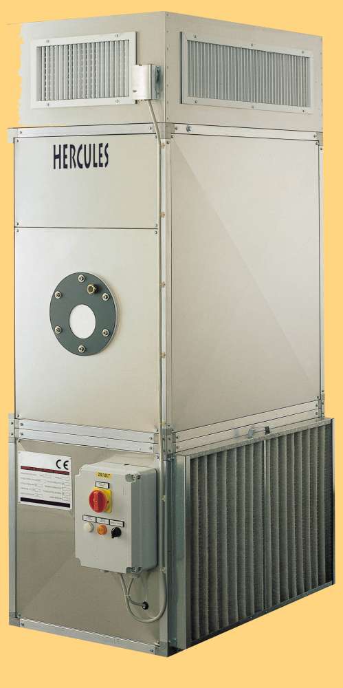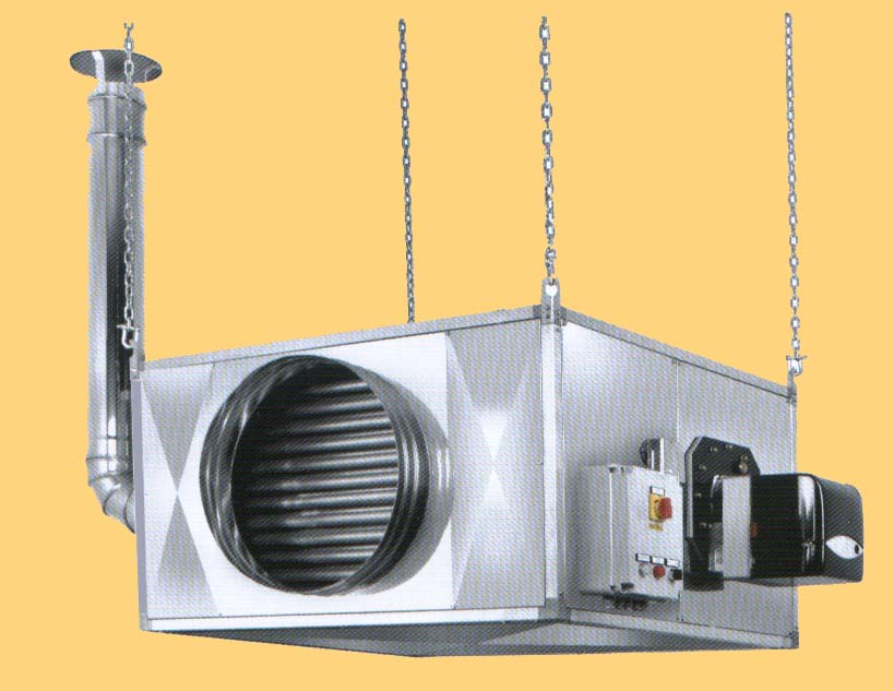 2. Radiál ventilátorral szerelt család, ami több külön álló helyiség fűtésére is alkalmas, mivel a kifúvott levegőt a magas nyomás miatt, csöveken el lehet vezetni. Vagy egy hosszú helyiséget, a mennyezet alatt végig vezetett perforált befúvó csővel, fóliatömlővel, elosztott meleg levegővel, egyenletesen lehet fűteni